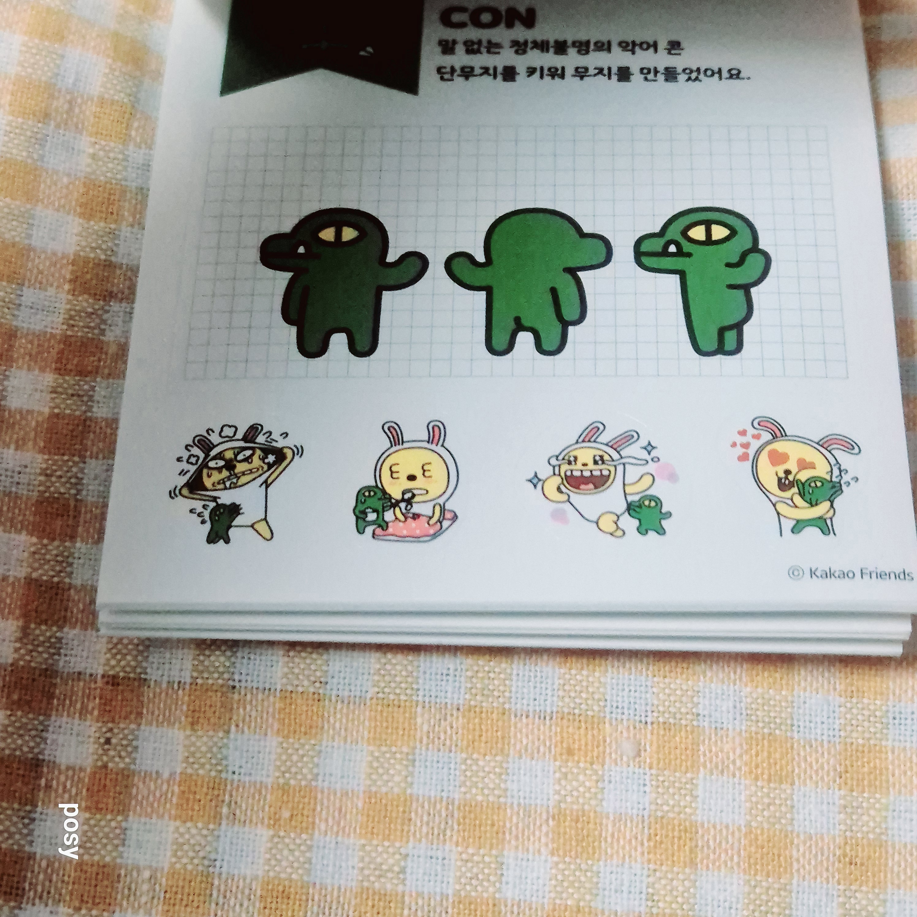 그리고 그 다음장에 나왔던 것이 콘이었는데, 소신발언적으로다가 제가 카카오 프렌즈에서 가장 좋아하는 캐릭터는 사실 콘이거든요. 작아서 존재감이 없다고 생각할 수도 있지만. 진짜 작어서 그 존재감이 더하는 친구인 것 같다는 것이 저의 개인적인 생각입니다. 이 친구는 말 없는 정체불명의 악어 콘입니다. 단무지를 키워 무지를 만들었다고 하는 어찌 보면 잘 모르는 사람은 콘이 무지의 반려동물이다(?) 생각할 수도 있지만 사실은 그 반대였다!