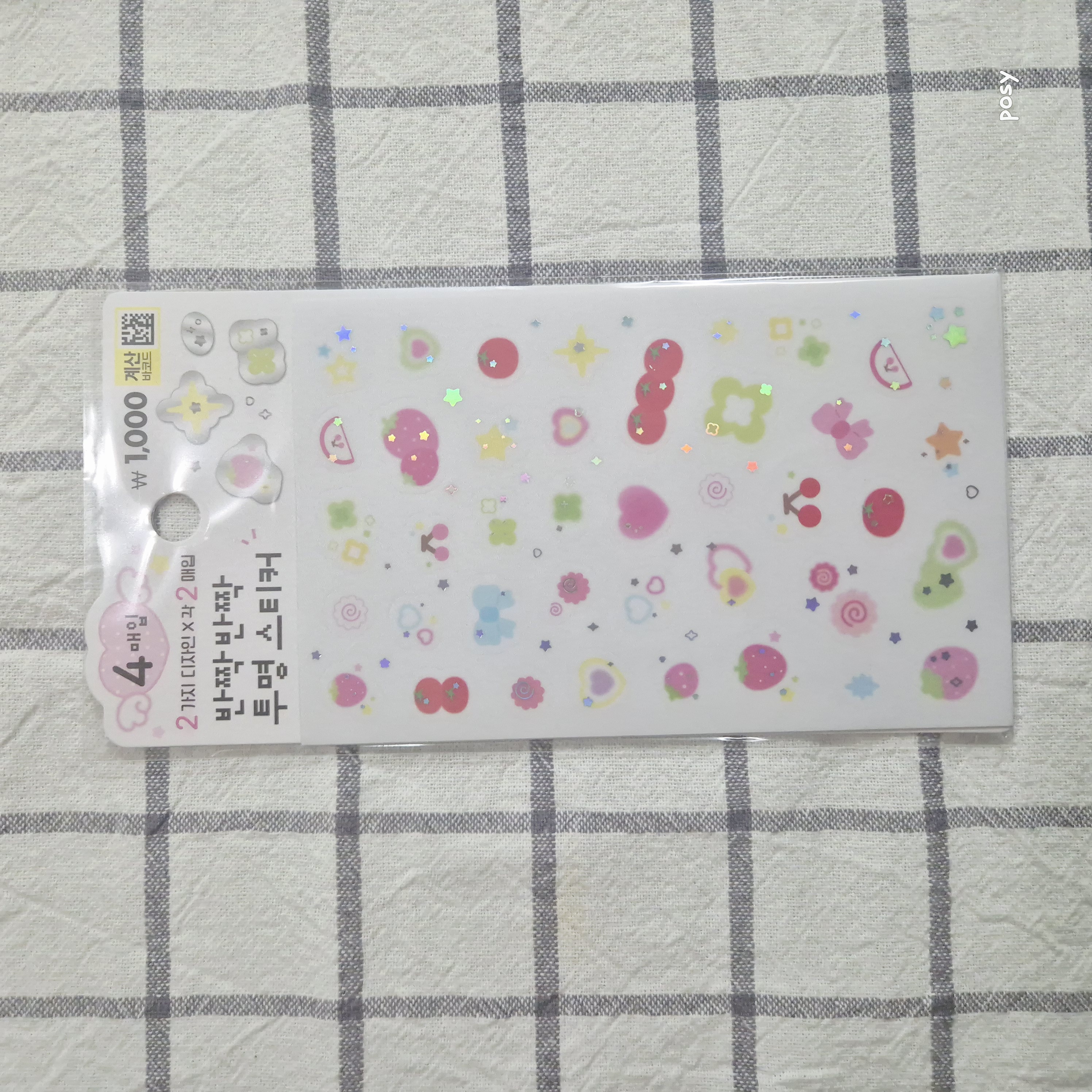 다섯 번째입니다. 반짝반짝한 투명 스티커인데요, 투명 스티커라 부담 없이 쓰기 너무 좋고 반짝반짝해서 포인트로 딱입니다. 한 두개를 포인트로 사용하기도 좋고, 크거나 엄청 눈에 띄는 디자인 종류는 아니라서 괜찮을 것 같더라고요. 크게 호불호는 없을 것 같죠? 생각보다 활용도가 정말 좋아서 금방 사용 하더라고요.. 이런 아이템이 기본템이라면 오늘 가져온 것들 중에 은박 별 다음으로 기본 템이 아닐까 생각됩니다. 처음에 봤을 때는 가장 안 쓸 것 같았는데 말이죠..