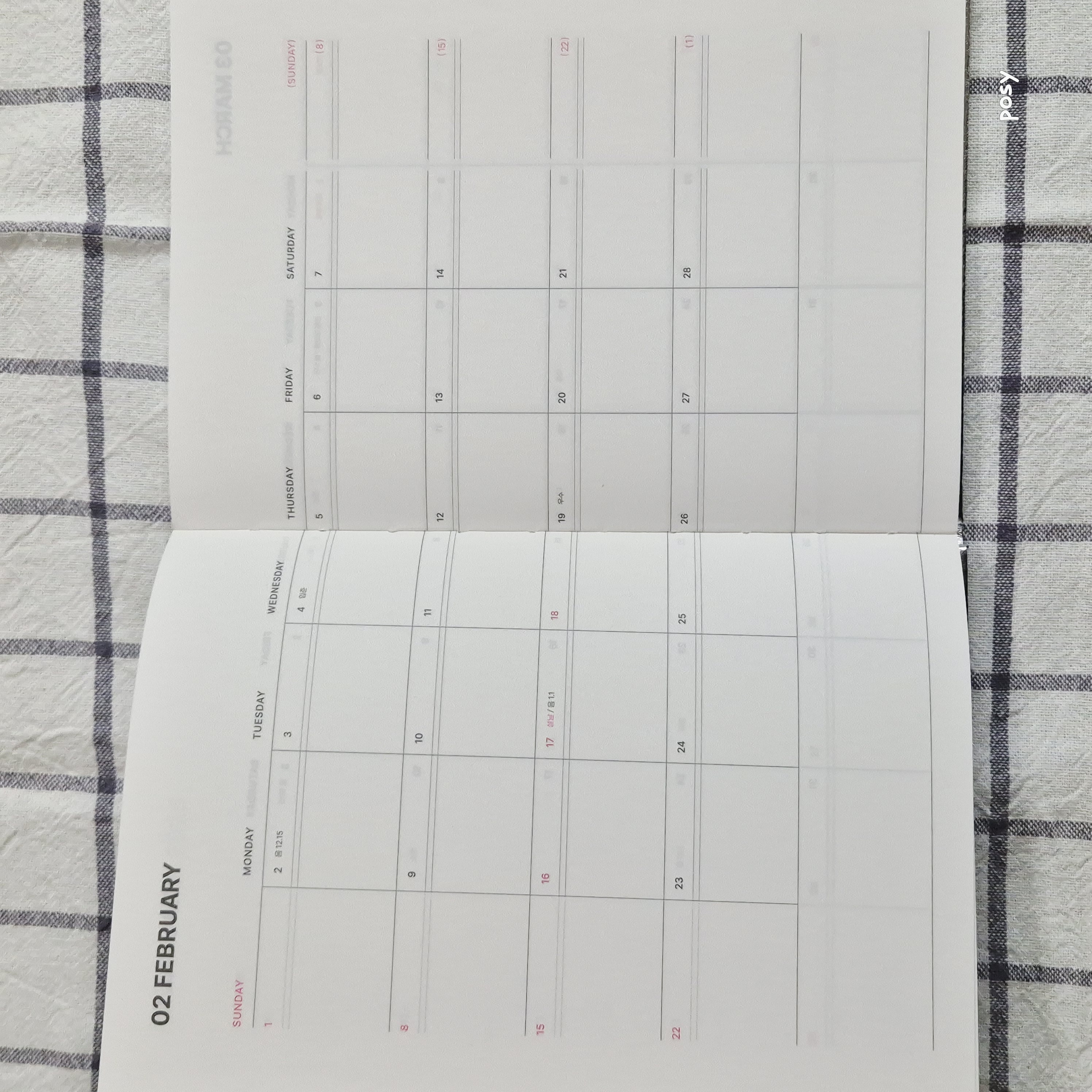 열면 달력이 굉장히 큼지막하게 구성이 되어 있습니다. 일요일을 이어쓸 수 있게 되어 있는 게 이런 말인데 굉장히 눈에 확 들어오죠? 그러면서 동시에 이질감이 느껴지지도 않은 위치 선정으로 인하여 편하게 사용할 수 있을 것 같았습니다.