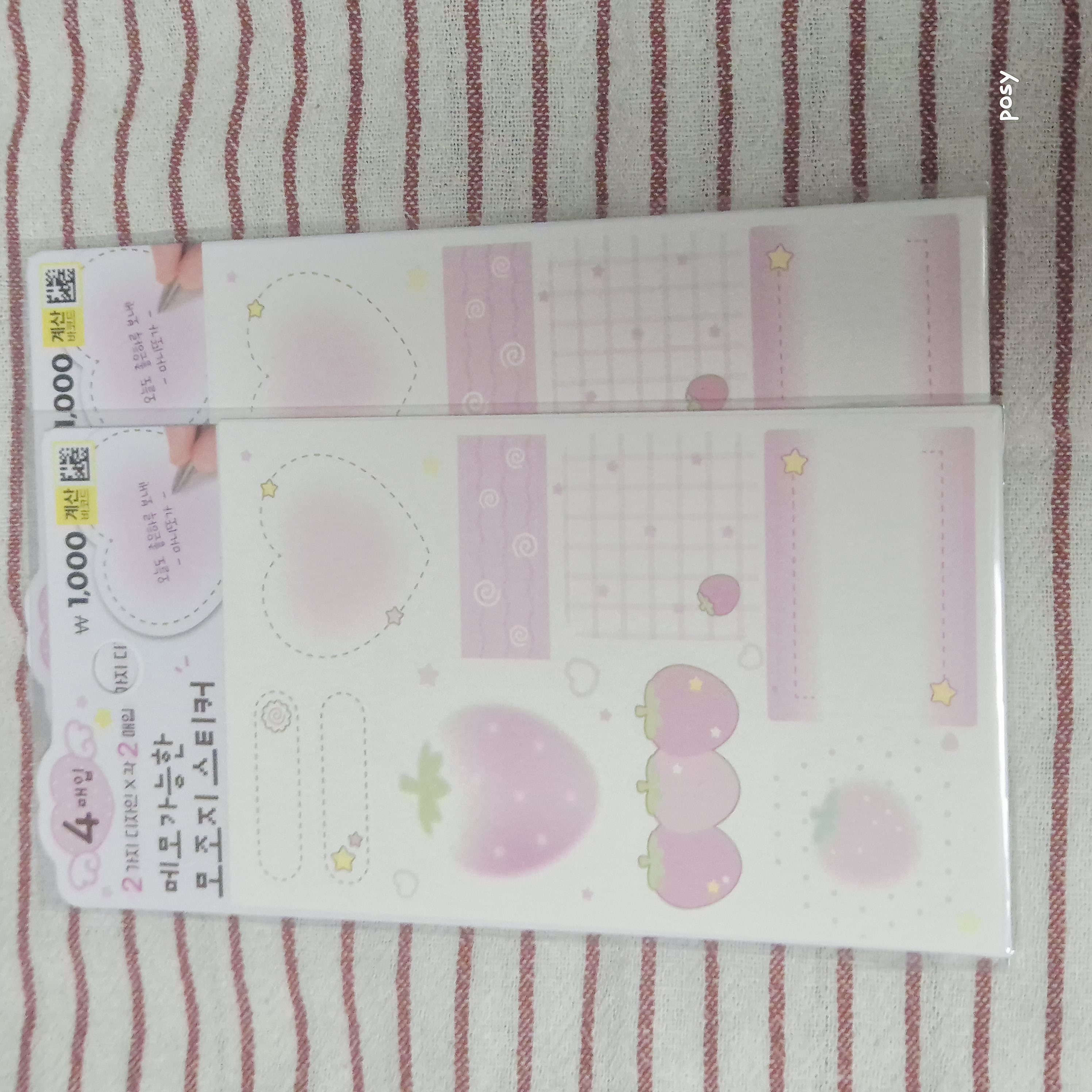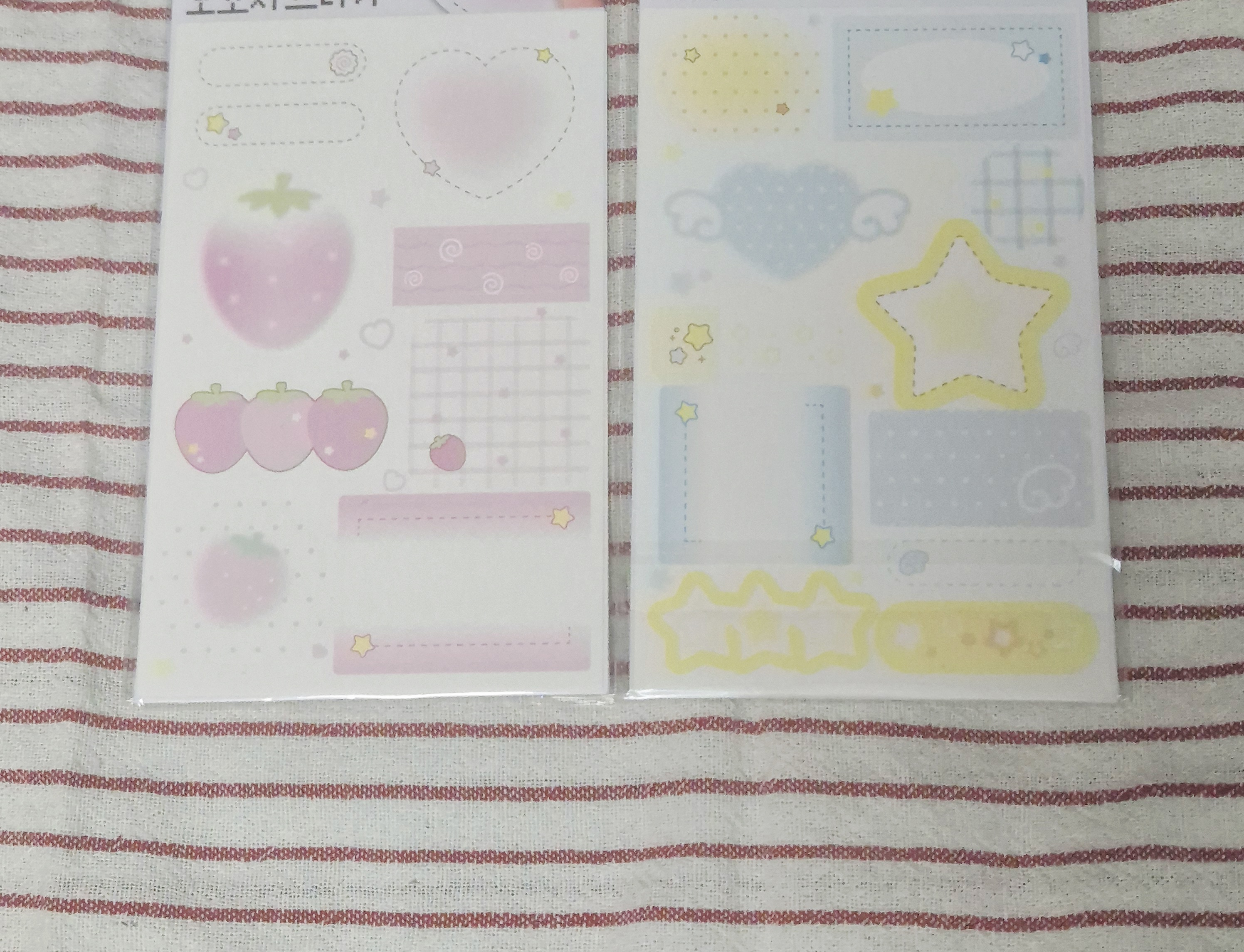 안녕하세요. posy입니다. 오늘은 너무 귀엽고 깜찍한 모조지가 들어가 있는 스티커 팩을 가져왔습니다. 핑크&화이트 테마의 딸기가 그려진 디자인과 옐로우&블루의 테마의 별이 그려진 디자인이 각 2장씩 구성되어 있으며, 생각보다 굉장히 예쁘더라고요.. 활용도? 두말할 필요가 없습니다. 확싥히 블러라서 그런지 정말 어디에도 사용하기 좋고 전반적인 디자인 모양 자체도 뭔가 특정한 테마가 있는 것이 아니라 여기저기 사용할 수 있도록 나왔더라고요.