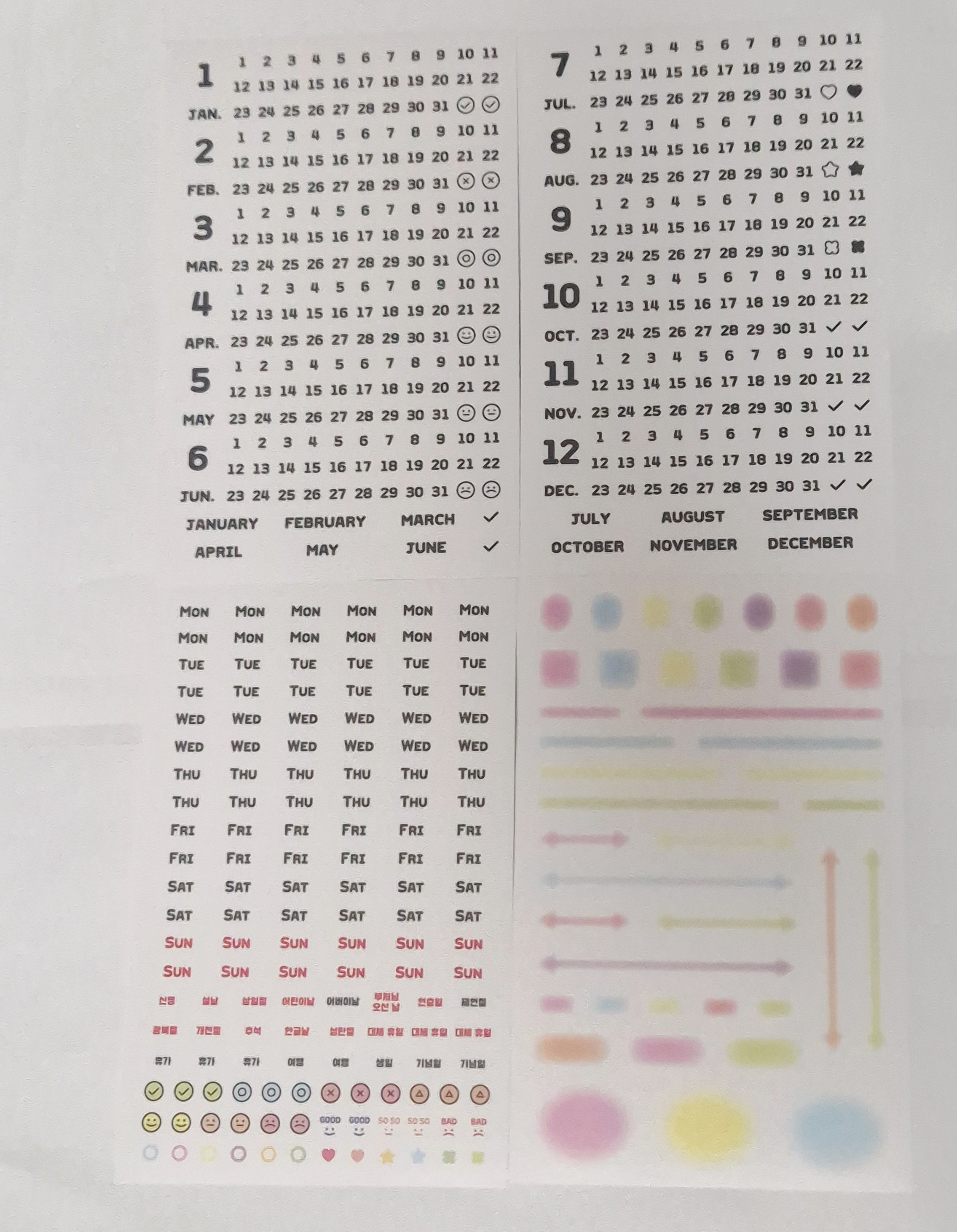디자인을 한 번 살펴볼까요? 1월부터 12월 모든 월과 달이 다 있는 것은 기본이오.. 세 번째 장에 보이는 요일도 엄청나게 많고요.. 바닥에 보면 아기자기한 쓸만한 기호들에 4번째 장이 진짜 킥인데.. 개인적으로 블러 시리즈라 이 장이 추가된 것 같기는 하지만 이 장과 같은 블러 스티커만 또 한가득 내줬어도 좋지 않았을까 하는 생각이 또 들기는 하더라고요. 아주 약간의 아쉬움이기는 하지만.. 왜냐면 이게 또 펜이나 색연필로 하면 이런 느낌이 들기가 쉽지 않거든요. 생각보다 너무 연하거나 진해서 완벽히 내가 원하는 색감을 내기가 힘든데.. 이런 스티커 붙이면 바로 되는 거 아시죠?