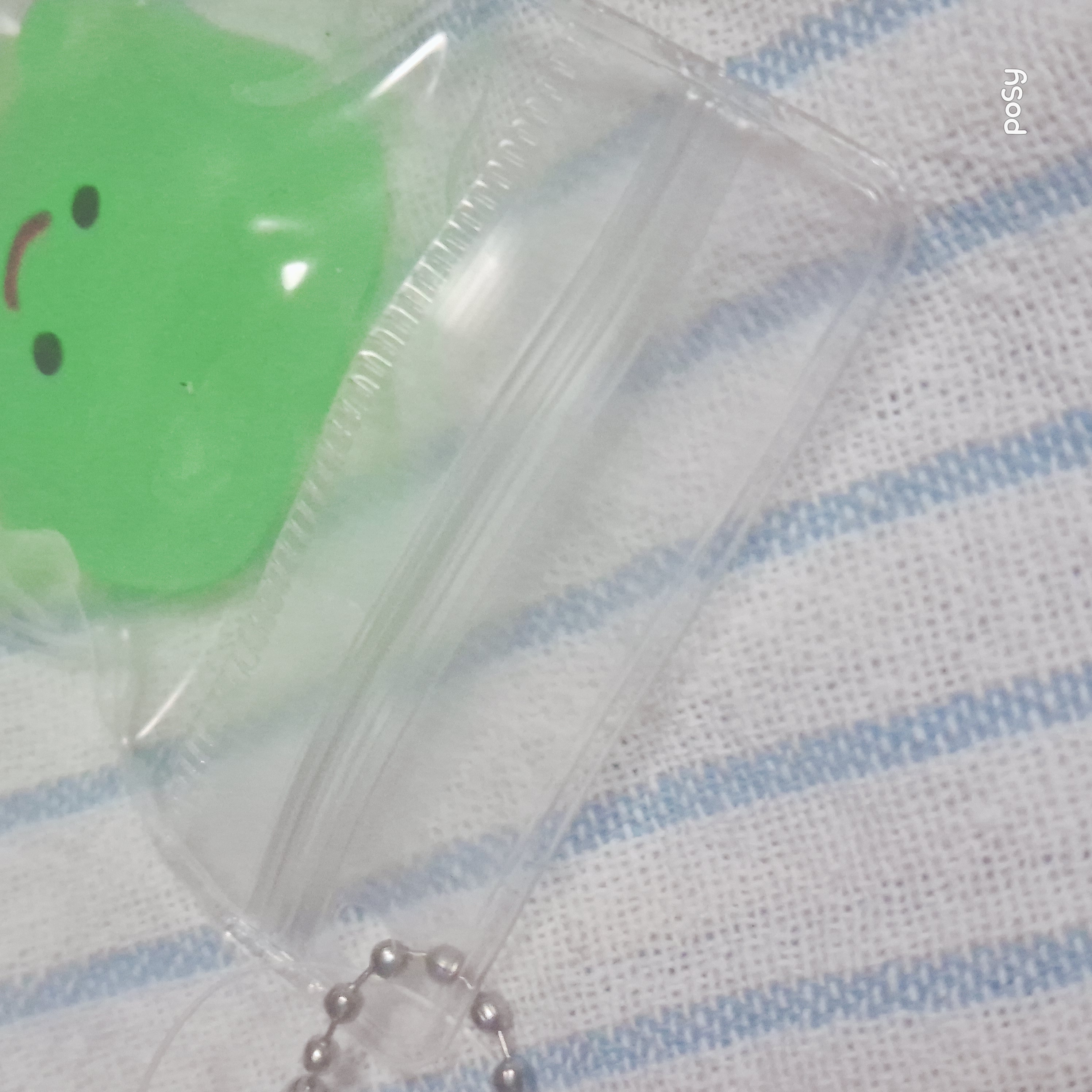 가까이서 보면 이렇습니다. 정말 아예 안 열리는 게 보이시죠? 실제로 저기 지퍼백 부분이 있어 보이기는 하는데 가 쪽에 완전한 밀봉이 되어 있기 때문에 솔직히 열리나 싶어서 열어 보려고 이래저래 해보기는 했는데 정말 칼로 자르는 게 아니라면 절떄로 밀봉이 풀릴 것 같지는 않더라고요. 오히려 짱짱해서 마음 놓고 키 링을 걸고 다닐 수 있었습니다. 정말 좋은 점은 말랑이의 단점 중 하나가 너무 말랑말랑하고 손으로 계속 만지는 것이다 보니 손 때가 잘 탈 수 있다는 점 아니겠어요? 근데 정말 다행히 이렇게 지퍼백이 되어 있으니 그냥 키 링 걸듯이 걸어 놓은 다음에 필요할 때마다 사용하면 딱 좋겠더라고요.