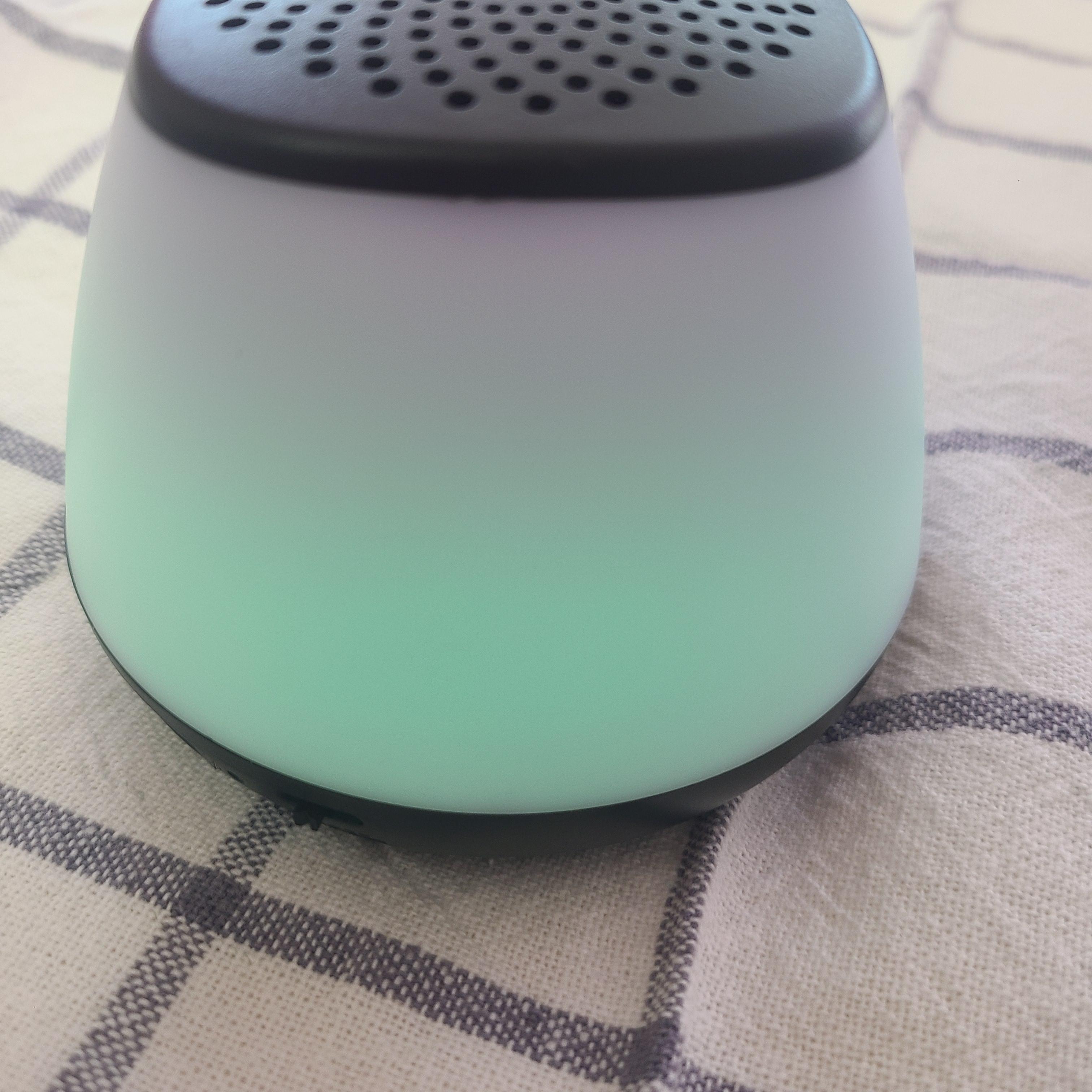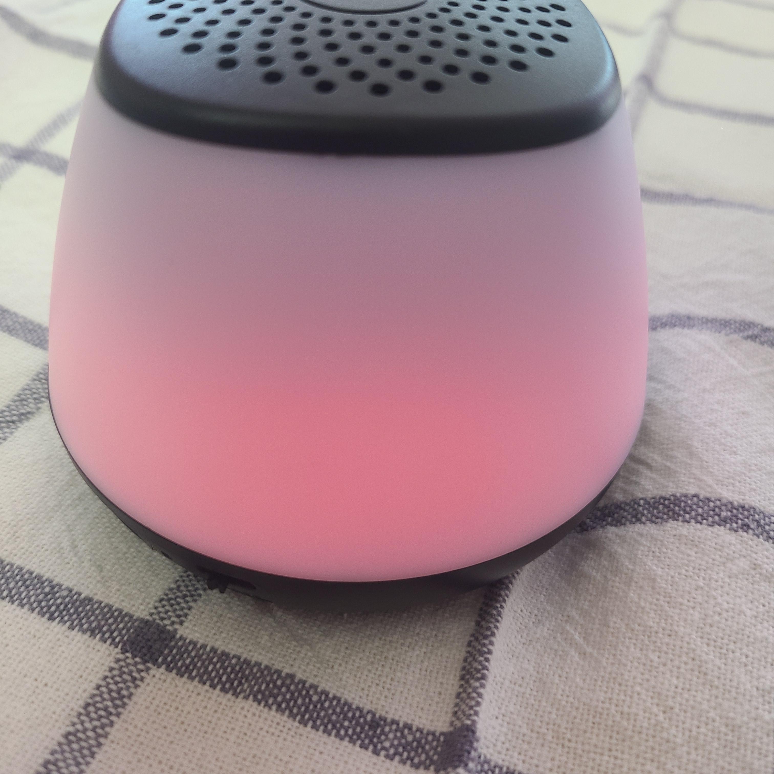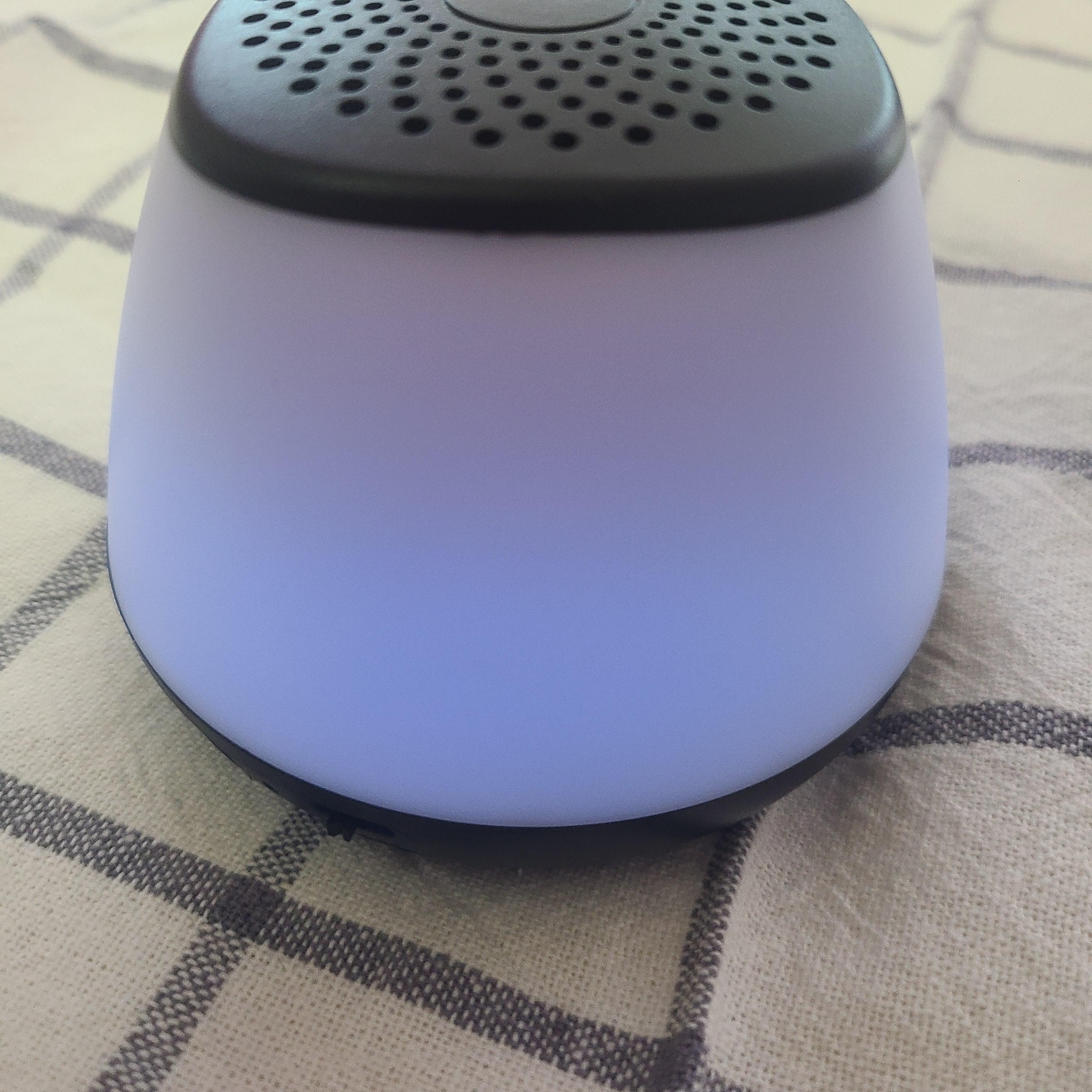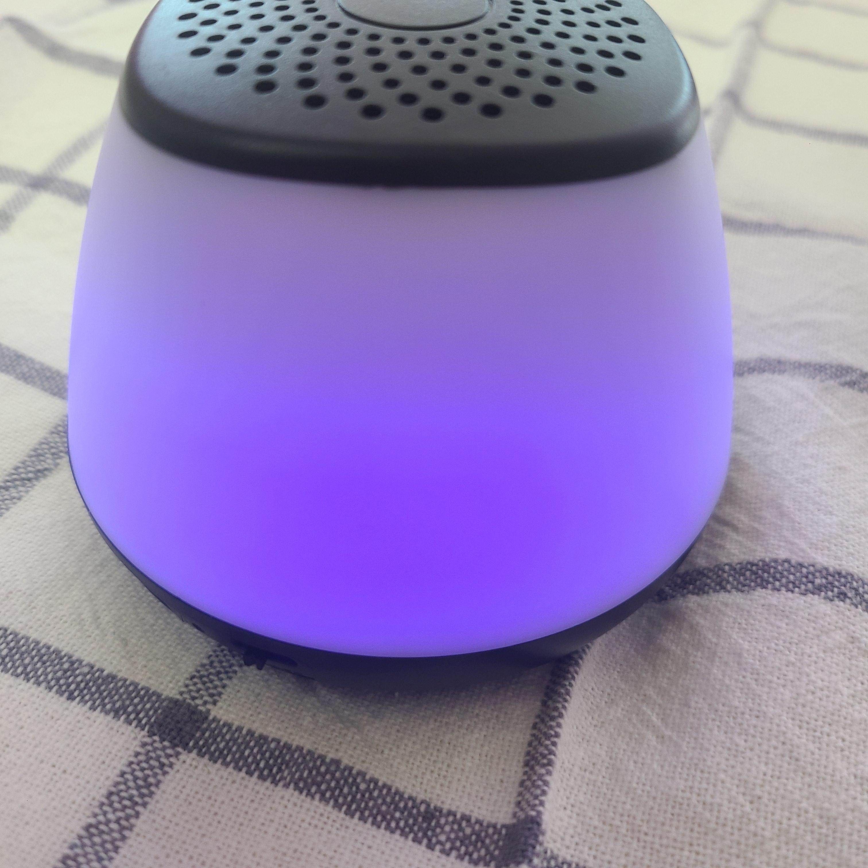 그리고 보라색! 제가 제일 좋아하는 색이죠~ 진하게 잘 나와서 좋았습니다. 아무튼 다양한 색깔이 번갈아 가면서 은은하게 잘 나오고, 심지어 그게 이 스피커 자체의 모양과 너무 잘 어우러져서 마음에 들었습니다. 특이한 디자인도 아니고 진짜 어디에다 놓더라도 심플의 정석이라서.. 인테리어 용으로도 좋을 것 같았는데, 스피커 기능까지.. 오브젝트를 일부러 사서 인테리어 하는 사람들이 많은 요즘.. 저는 이런 식으로 기능이 있는 오브젝트들을 선호하는 편이기 때문에 이것도 인테리어 용으로 하나 사용이 가능할 것 같습니다.