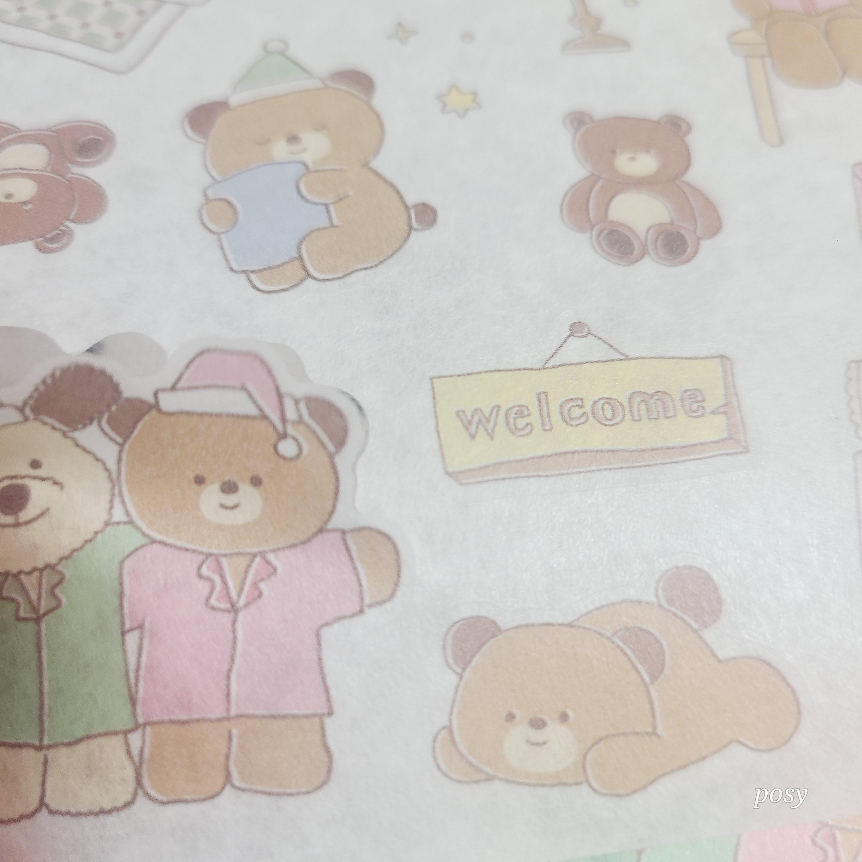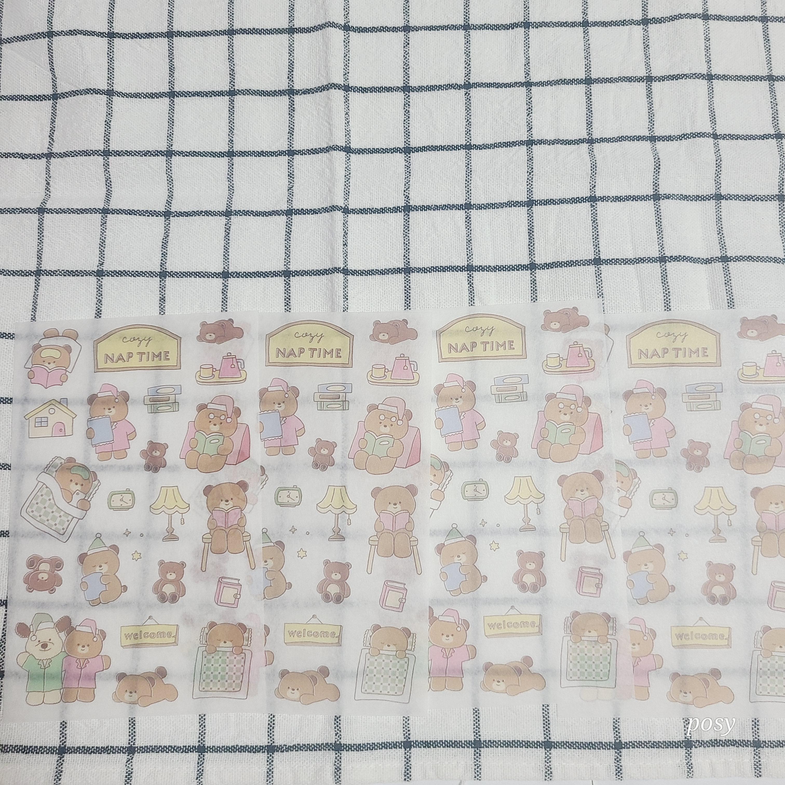 안녕하세요. posy입니다. 오늘은 곰 캐릭터 마스킹 지 스티커를 가져왔습니다. 마스킹지로 이루어진 스티커는 보통 스티커북들이 전부였어서 그런지 저는 이런 판으로 된 건 또 익숙치 않더라고요. 그렇지만 마스킹 지 특유의 종이 질감 같은 보드라운 느낌을 좋아하는 저에게 이 상품은 상당히 메리트가 있었습니다. 그리고 사실 이런 약간이라도 새로운 거 나오면 저는 무조건 도전해보는 주의거든요 ㅎㅎ 그래서 바로 구매해봤습니다. 전체적으로 다들 잠자리에 자러 가는 뒹굴 거리는 저녁 밤의 분위기를 담고 있었습니다. 코지어텀 캐릭터가 전반적으로 둥글둥글한 캐릭터들인 만큼 이런 분위기에 더 잘 어울리기는 하더라고요. 실사는 이거보다는 날카로운? 분위기라 독서 곰돌이가 더 잘 어울린다고 생각되었다면, 마스킹 테이프는 부드러워서 이런 느긋한 분위기가 잘 어울리더라고요. 물론 지극히 개인적인 생각이기는 합니다만, 저는 그렇게 생각되었습니다. 이제 상세히 살펴보도록 할까요?