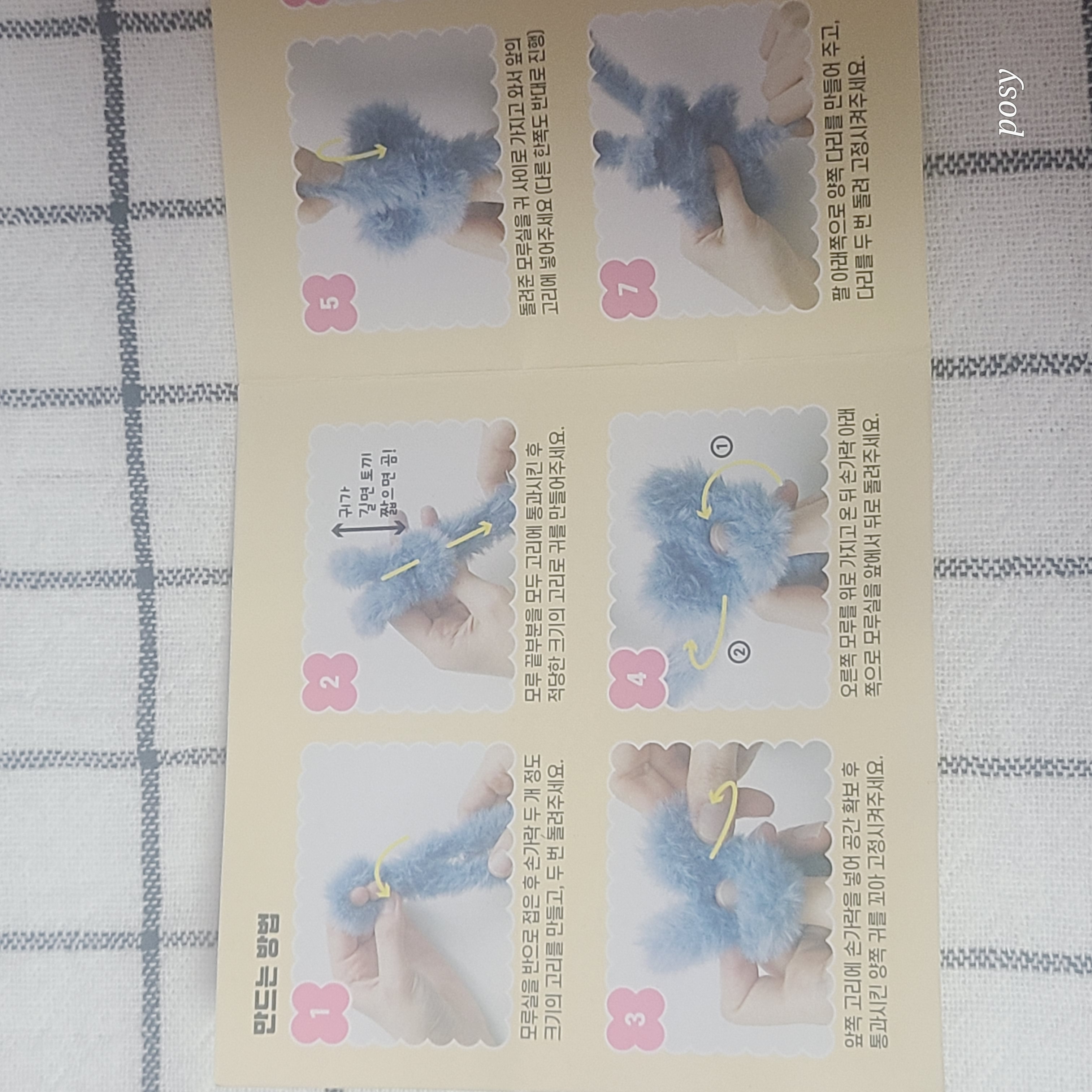 하나씩 살펴보면 눈, 코 1쌍씩과 열쇠고리, O링과 하트참, 우레탄줄, 구슬, 설명서 그리고 제일 중요한 밍크 모루가 있습니다. 1.2m인데 그다지 능숙치 않은 제가 하더라도 부족하거나 한 거 없어 딱 좋게 넉넉한 길이더라고요.